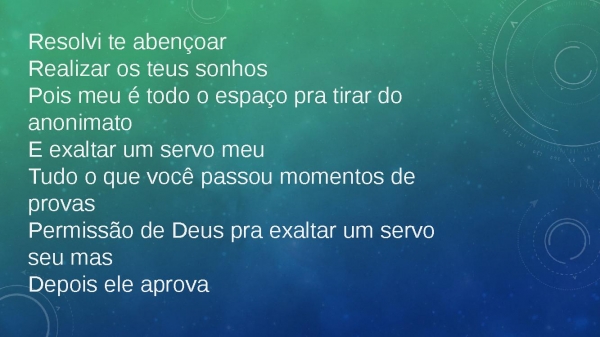 - Resolvi te abençoarRealizar os teus sonhosPois meu é todo o espaço pra tirar do anonimatoE exaltar um servo meuTudo o que você passou momentos de provasPermissão de Deus pra exaltar um servo seu masDepois ele aprova