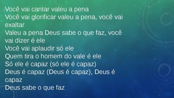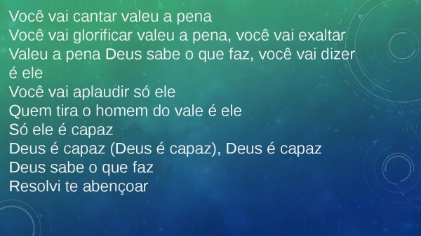 - Você vai cantar valeu a penaVocê vai glorificar valeu a pena, você vai exaltarValeu a pena Deus sabe o que faz, você vai dizer é eleVocê vai aplaudir só eleQuem tira o homem do vale é eleSó ele é capazDeus é capaz (Deus é capaz), Deus é capazDeus sabe o que fazResolvi te abençoar