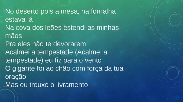 - No deserto pois a mesa, na fornalha estava láNa cova dos leões estendi as minhas mãosPra eles não te devoraremAcalmei a tempestade (Acalmei a tempestade) eu fiz para o ventoO gigante foi ao chão com força da tua oraçãoMas eu trouxe o livramento