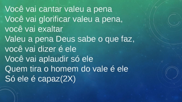 - Você vai cantar valeu a penaVocê vai glorificar valeu a pena, você vai exaltarValeu a pena Deus sabe o que faz, você vai dizer é eleVocê vai aplaudir só eleQuem tira o homem do vale é eleSó ele é capaz(2X)