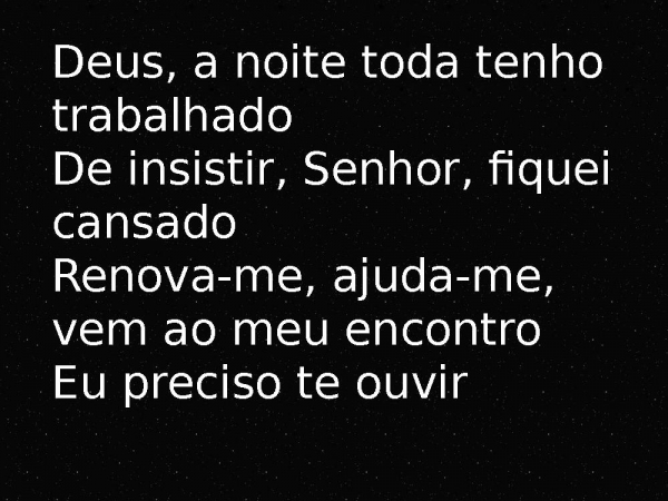 - Deus, a noite toda tenho trabalhadoDe insistir, Senhor, fiquei cansadoRenova-me, ajuda-me, vem ao meu encontroEu preciso te ouvir