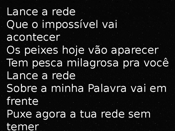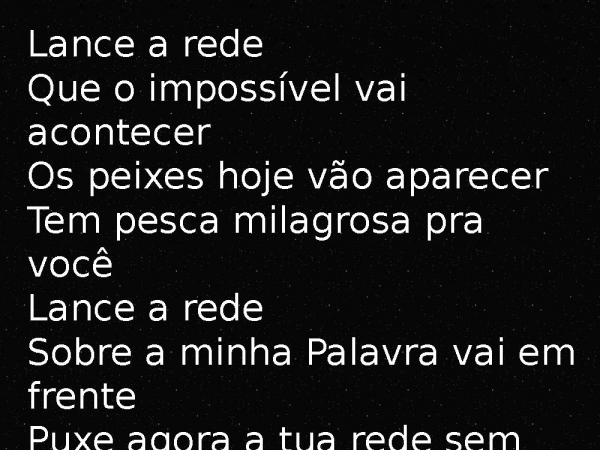 - Lance a redeQue o impossível vai acontecerOs peixes hoje vão aparecerTem pesca milagrosa pra vocêLance a redeSobre a minha Palavra vai em frentePuxe agora a tua rede sem temerTem fartura de milagres pra você