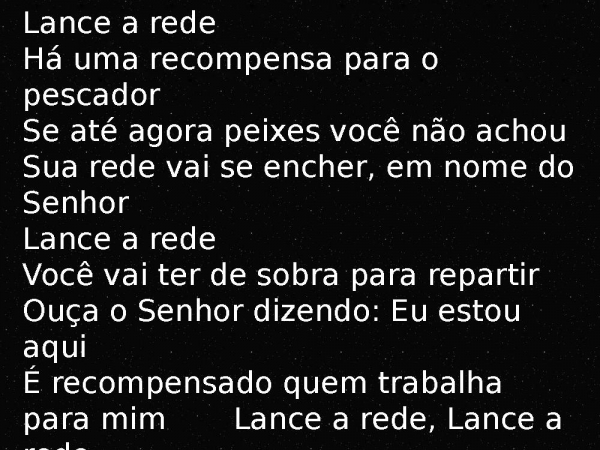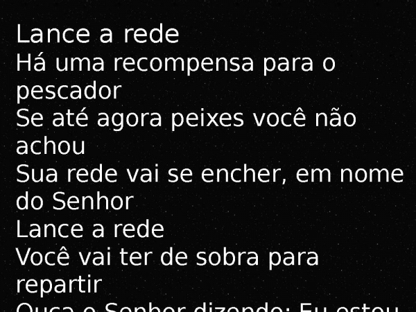 - Lance a redeHá uma recompensa para o pescadorSe até agora peixes você não achouSua rede vai se encher, em nome do SenhorLance a redeVocê vai ter de sobra para repartirOuça o Senhor dizendo: Eu estou aquiÉ recompensado quem trabalha para mim Lance a rede, Lance a rede