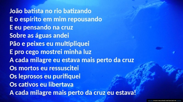 - Esta Foto de Autor Desconhecido está licenciado em CC BY-SAJoão batista no rio batizandoE o espírito em mim repousandoE eu pensando na cruzSobre as águas andeiPão e peixes eu multipliqueiE pro cego mostrei minha luzA cada milagre eu estava mais perto da cruzOs mortos eu ressusciteiOs leprosos eu purifiqueiOs cativos eu libertavaA cada milagre mais perto da cruz eu estava!
