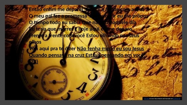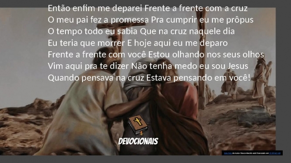 - Esta Foto de Autor Desconhecido está licenciado em CC BY-NC-NDEntão enfim me deparei Frente a frente com a cruzO meu pai fez a promessa Pra cumprir eu me prôpusO tempo todo eu sabia Que na cruz naquele diaEu teria que morrer E hoje aqui eu me deparoFrente a frente com você Estou olhando nos seus olhosVim aqui pra te dizer Não tenha medo eu sou JesusQuando pensava na cruz Estava pensando em você!