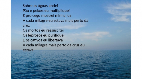 - Sobre as águas andeiPão e peixes eu multipliqueiE pro cego mostrei minha luzA cada milagre eu estava mais perto da cruzOs mortos eu ressusciteiOs leprosos eu purifiqueiE os cativos eu libertavaA cada milagre mais perto da cruz eu estava!