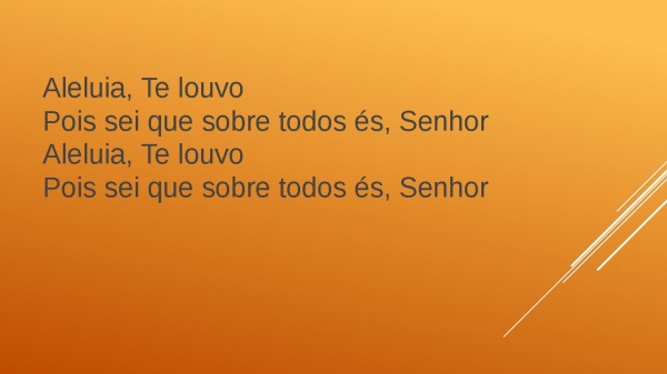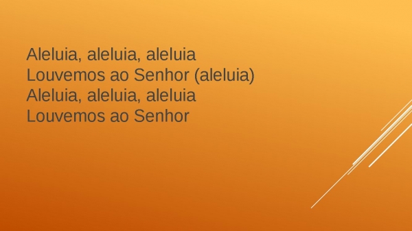 - Aleluia, aleluia, aleluiaLouvemos ao Senhor (aleluia)Aleluia, aleluia, aleluiaLouvemos ao Senhor