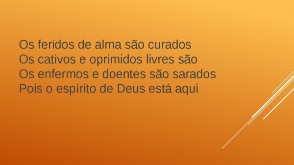 - Os feridos de alma são curadosOs cativos e oprimidos livres sãoOs enfermos e doentes são saradosPois o espírito de Deus está aqui