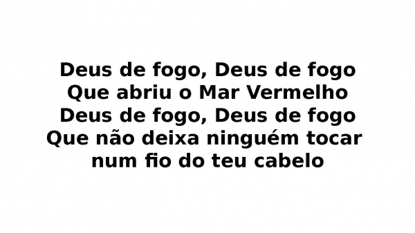- Deus de fogo, Deus de fogoQue abriu o Mar VermelhoDeus de fogo, Deus de fogoQue não deixa ninguém tocar num fio do teu cabelo