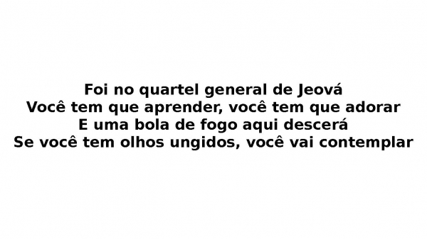 - Foi no quartel general de JeováVocê tem que aprender, você tem que adorarE uma bola de fogo aqui desceráSe você tem olhos ungidos, você vai contemplar