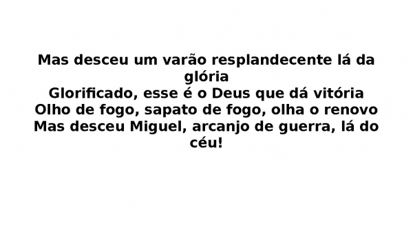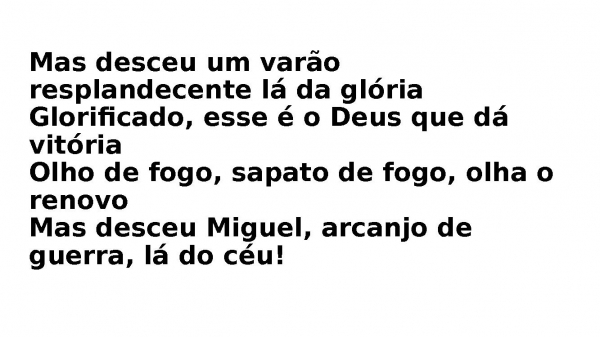 - Mas desceu um varão resplandecente lá da glóriaGlorificado, esse é o Deus que dá vitóriaOlho de fogo, sapato de fogo, olha o renovoMas desceu Miguel, arcanjo de guerra, lá do céu!