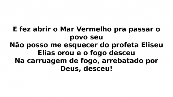- E fez abrir o Mar Vermelho pra passar o povo seuNão posso me esquecer do profeta EliseuElias orou e o fogo desceuNa carruagem de fogo, arrebatado por Deus, desceu!