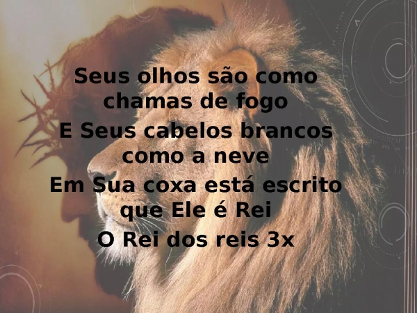 - Seus olhos são como chamas de fogoE Seus cabelos brancos como a neveEm Sua coxa está escrito que Ele é ReiO Rei dos reis 3x