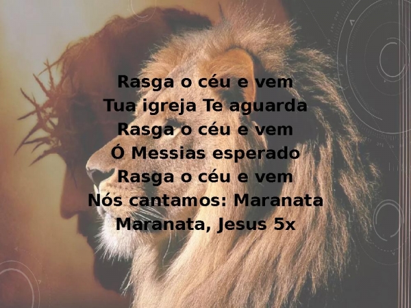 - Rasga o céu e vemTua igreja Te aguardaRasga o céu e vemÓ Messias esperadoRasga o céu e vemNós cantamos: MaranataMaranata, Jesus 5x