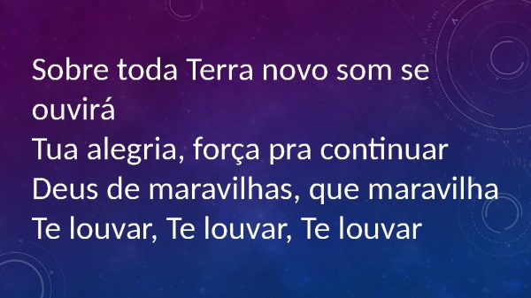 - Sobre toda Terra novo som se ouviráTua alegria, força pra continuarDeus de maravilhas, que maravilhaTe louvar, Te louvar, Te louvar