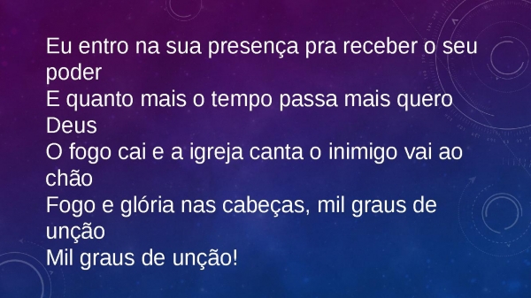 - Eu entro na sua presença pra receber o seu poderE quanto mais o tempo passa mais quero DeusO fogo cai e a igreja canta o inimigo vai ao chãoFogo e glória nas cabeças, mil graus de unçãoMil graus de unção!
