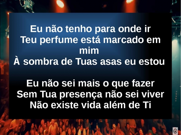 - Eu não tenho para onde irTeu perfume está marcado em mim À sombra de Tuas asas eu estou Eu não sei mais o que fazerSem Tua presença não sei viverNão existe vida além de Ti