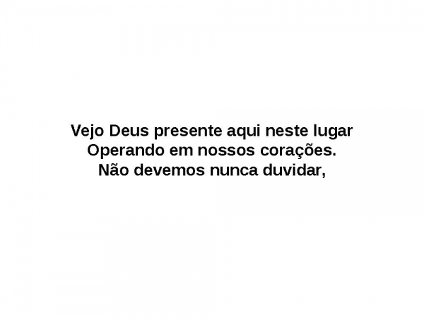 - Vejo Deus presente aqui neste lugarOperando em nossos corações.Não devemos nunca duvidar,