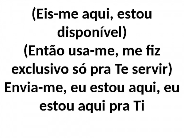 - E eis-me aqui, estou disponívelEntão usa-me (peça, peça, peça!), me fiz exclusivo só pra Te servirMeu Deus, envia-meComo eu poderia dizer não?