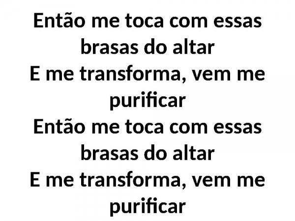 - Então me toca com essas brasas do altarE me transforma, vem me purificarEntão me toca com essas brasas do altarE me transforma, vem me purificar