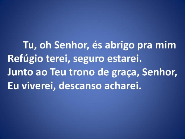 - Tu, oh Senhor, és abrigo pra mim Refúgio terei, seguro estarei. Junto ao Teu trono de graça, Senhor, Eu viverei, descanso acharei.