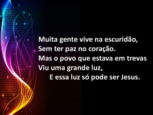 - Muita gente vive na escuridão, Sem ter paz no coração. Mas o povo que estava em trevas Viu uma grande luz, E essa luz só pode ser Jesus.