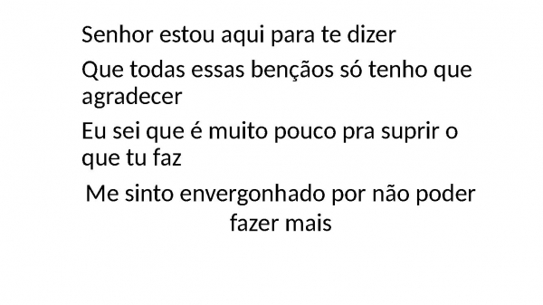 - Senhor estou aqui para te dizer Que todas essas bençãos só tenho que agradecer Eu sei que é muito pouco pra suprir o que tu faz Me sinto envergonhado por não poder fazer mais