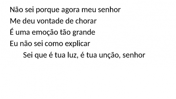 - Não sei porque agora meu senhor Me deu vontade de chorar É uma emoção tão grande Eu não sei como explicar Sei que é tua luz, é tua unção, senhor