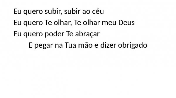 - Eu quero subir, subir ao céu Eu quero Te olhar, Te olhar meu Deus Eu quero poder Te abraçar E pegar na Tua mão e dizer obrigado