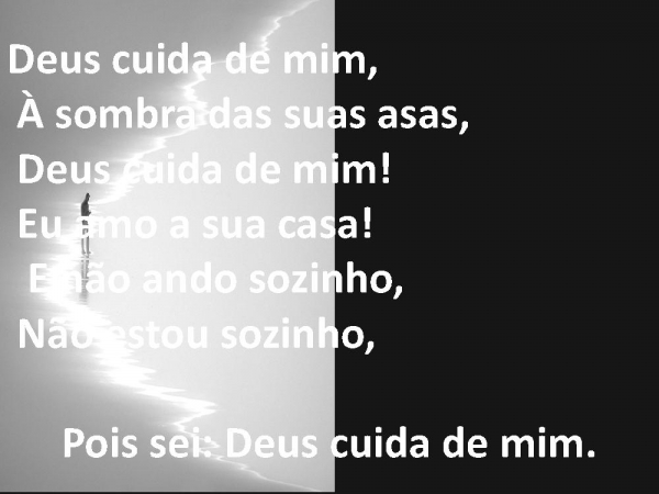 - Deus cuida de mim, à sombra das suas asas, Deus cuida de mim! Eu amo a sua casa! E não ando sozinho, não estou sozinho, Pois sei: Deus cuida de mim.