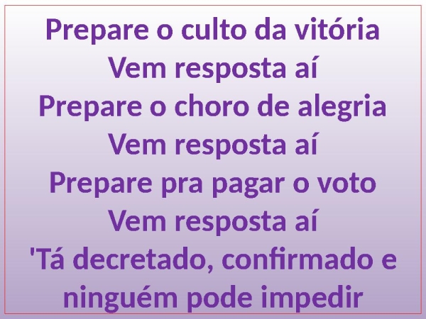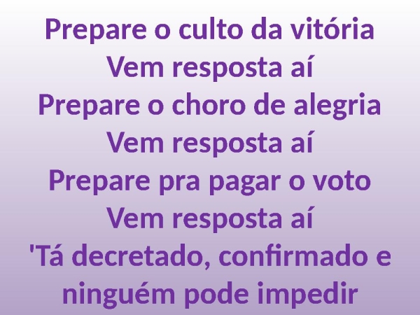 - Prepare o culto da vitóriaVem resposta aíPrepare o choro de alegriaVem resposta aíPrepare pra pagar o votoVem resposta aí'Tá decretado, confirmado e ninguém pode impedir