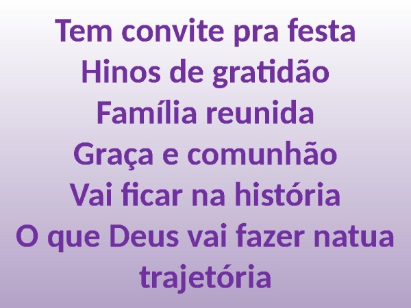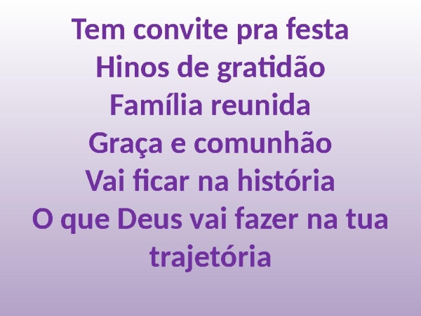- Tem convite pra festaHinos de gratidãoFamília reunidaGraça e comunhãoVai ficar na históriaO que Deus vai fazer na tua trajetória