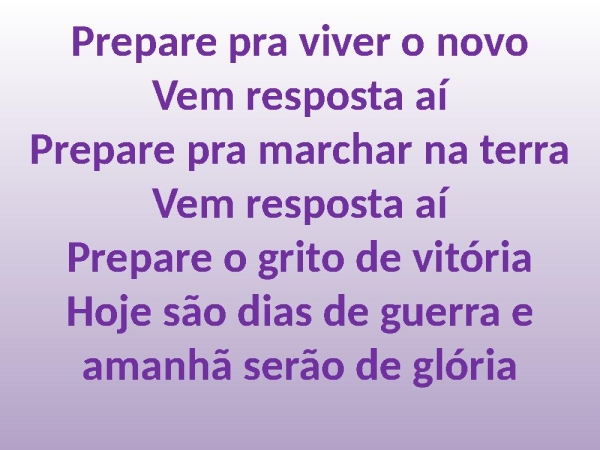 - Prepare pra viver o novoVem resposta aíPrepare pra marchar na terraVem resposta aíPrepare o grito de vitóriaHoje são dias de guerra e amanhã serão de glória