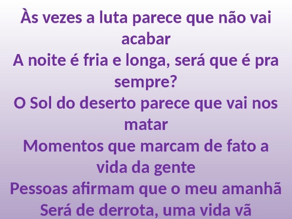 - Às vezes a luta parece que não vai acabarA noite é fria e longa, será que é pra sempre?O Sol do deserto parece que vai nos matarMomentos que marcam de fato a vida da gentePessoas afirmam que o meu amanhãSerá de derrota, uma vida vã