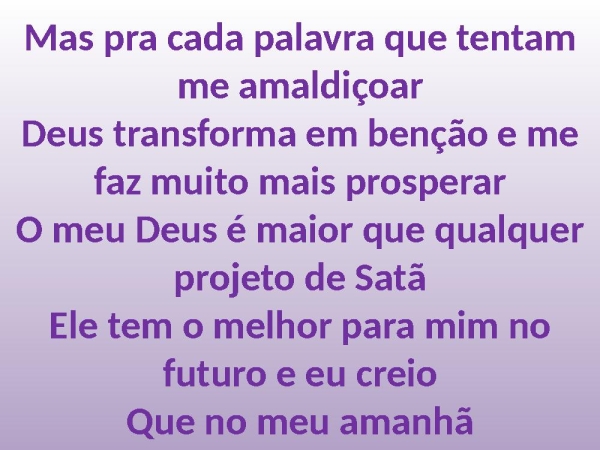 - Mas pra cada palavra que tentam me amaldiçoarDeus transforma em benção e me faz muito mais prosperarO meu Deus é maior que qualquer projeto de SatãEle tem o melhor para mim no futuro e eu creioQue no meu amanhã