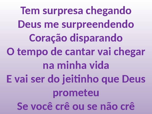 - Tem surpresa chegandoDeus me surpreendendoCoração disparandoO tempo de cantar vai chegar na minha vidaE vai ser do jeitinho que Deus prometeuSe você crê ou se não crê