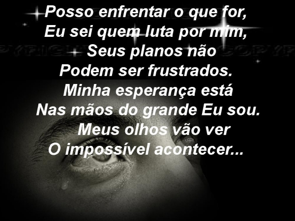 - Posso enfrentar o que for, Eu sei quem luta por mim, Seus planos não Podem ser frustrados. Minha esperança está Nas mãos do grande Eu sou. Meus olhos vão ver O impossível acontecer...