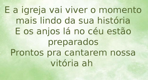 - E a igreja vai viver o momento mais lindo da sua históriaE os anjos lá no céu estão preparadosProntos pra cantarem nossa vitória ah