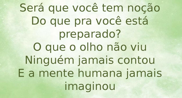 - Será que você tem noçãoDo que pra você está preparado?O que o olho não viuNinguém jamais contouE a mente humana jamais imaginou