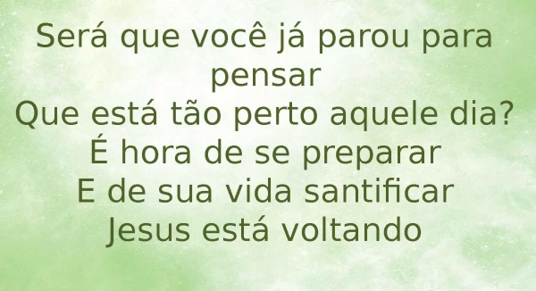 - Será que você já parou para pensarQue está tão perto aquele dia?É hora de se prepararE de sua vida santificarJesus está voltando