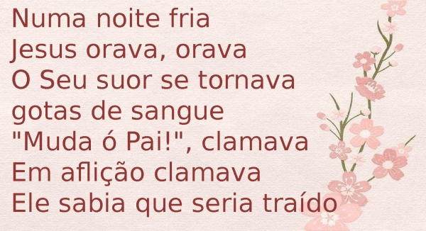 - Numa noite friaJesus orava, oravaO Seu suor se tornava gotas de sangue"Muda ó Pai!", clamavaEm aflição clamavaEle sabia que seria traído