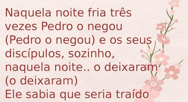 - Naquela noite fria três vezes Pedro o negou (Pedro o negou) e os seus discípulos, sozinho, naquela noite.. o deixaram (o deixaram)Ele sabia que seria traído