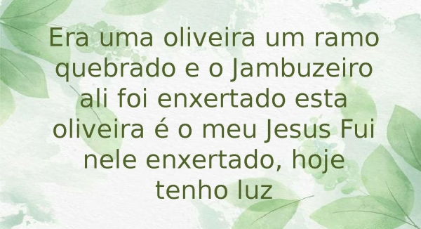 - Era uma oliveira um ramo quebrado e o Jambuzeiro ali foi enxertado esta oliveira é o meu Jesus Fui nele enxertado, hoje tenho luz