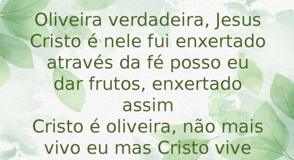 - Oliveira verdadeira, Jesus Cristo é nele fui enxertado através da fé posso eu dar frutos, enxertado assimCristo é oliveira, não mais vivo eu mas Cristo vive em mim