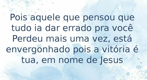- Pois aquele que pensou que tudo ia dar errado pra vocêPerdeu mais uma vez, está envergonhado pois a vitória é tua, em nome de Jesus