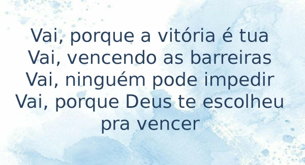 - Vai, porque a vitória é tuaVai, vencendo as barreirasVai, ninguém pode impedirVai, porque Deus te escolheu pra vencer