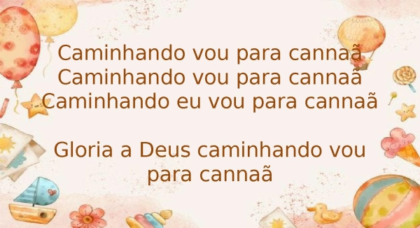 - Caminhando vou para cannaãCaminhando vou para cannaãCaminhando eu vou para cannaãGloria a Deus caminhando vou para cannaã