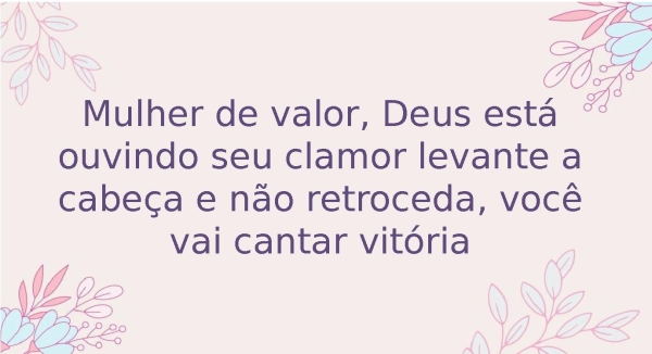 - Mulher de valor, Deus está ouvindo seu clamor levante a cabeça e não retroceda, você vai cantar vitória