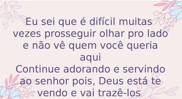 - Eu sei que é difícil muitas vezes prosseguir olhar pro lado e não vê quem você queria aquiContinue adorando e servindo ao senhor pois, Deus está te vendo e vai trazê-los com amor