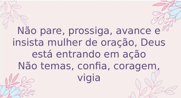 - Não pare, prossiga, avance e insista mulher de oração, Deus está entrando em açãoNão temas, confia, coragem, vigia